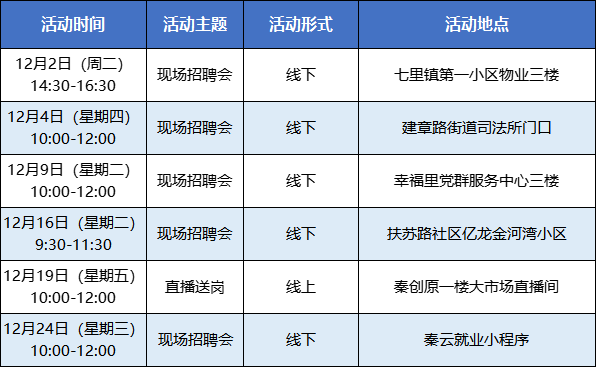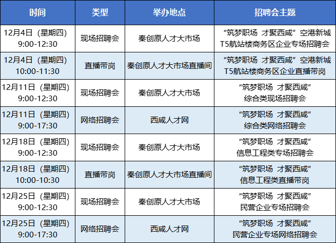 12月份,秦创原人才大市场、就业驿站将举办14场不同主题类型促就业活动,满足各企事业单位和广大求职者双选需求。