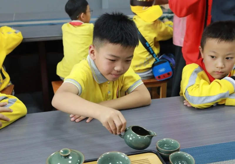 在茶艺课堂,孩子们学习茶具的使用方法,并在茶艺老师的指导下,进行了泡茶体验,掌握了基本的泡茶技能和茶桌礼仪。
