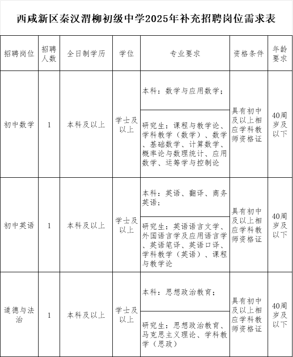 西咸新区秦汉渭柳初级中学是由西咸新区设立的公办初级中学,位于秦汉新城秦苑一路,周边交通便利,按照“团队引入合作办学”的“名校+”管理模式,由西咸新区教育体育局和西安市第一中学教育集团共同管理,先后荣获二十余项国家、省、市、区级办学荣誉,办学成效得到多方好评。现因发展需要,面向社会广纳英才,公开招聘。