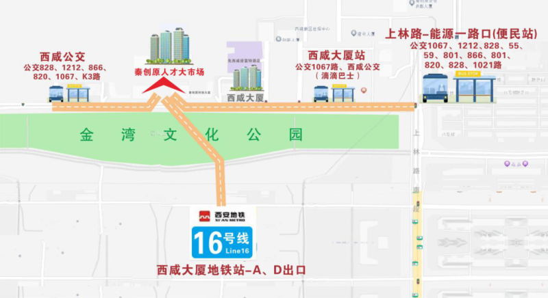 乘坐公交820路、866路至西咸大厦站下车,步行至秦创原人才大市场。