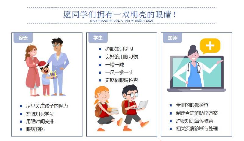 3、医疗机构:全面的眼部检查,建立视力档案、规范相关疾病诊断与处理,加强护眼知识宣传教育。