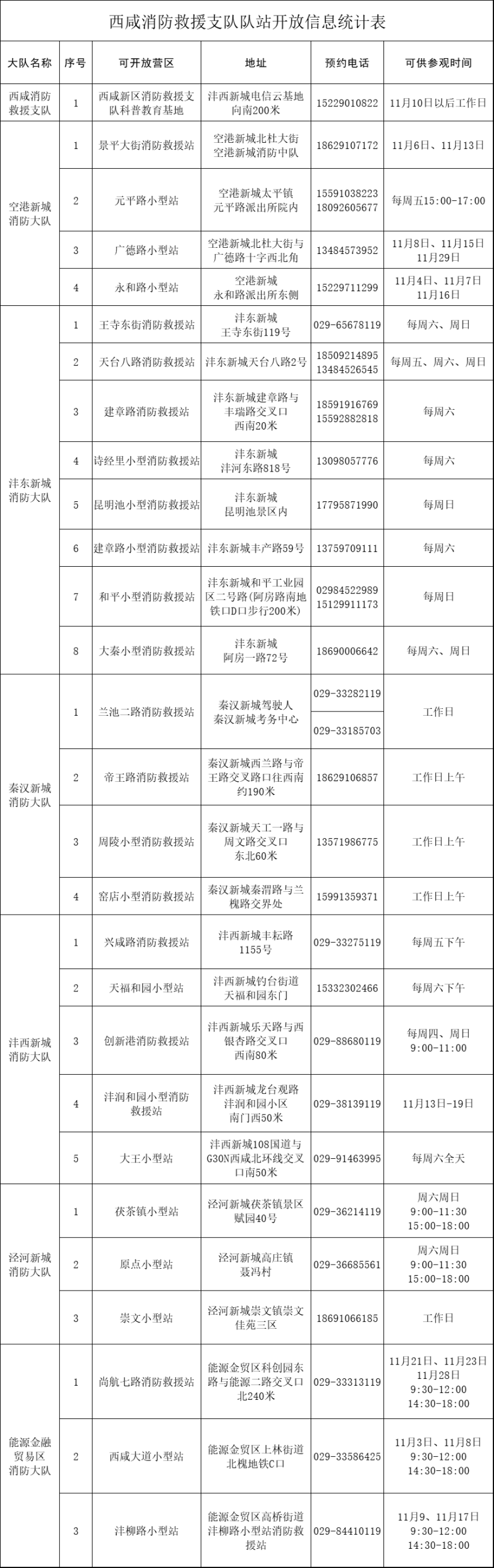 除了上述特色消防科普基地,西咸新区消防救援支队还在11月开展“119宣传月消防站开放”活动,面向社会统一开放新区28个消防站,市民可拨打预约电话就近预约参观。