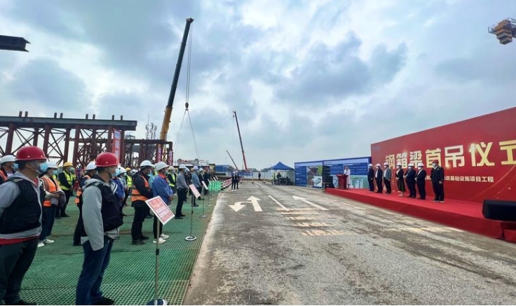 该项目钢结构桥梁总用钢量约1.7万吨,设计复杂且施工难度大,是桥梁工程建设过程中得控制性节点。此次钢箱梁首吊,不仅是高架桥梁工程建设的里程碑,更是T5站前商务区综合交通系统形成的最为关键的工序之一。