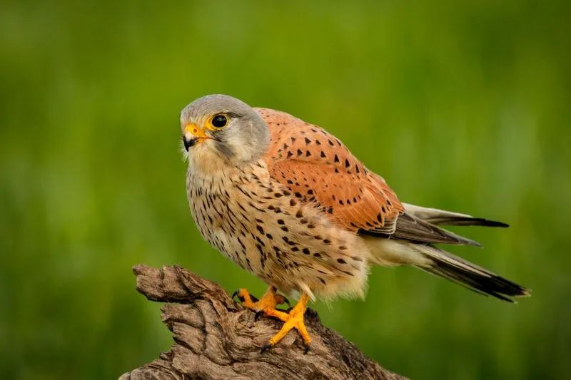 红隼,为隼科隼属的鸟类,是一种小型猛禽,别名:茶隼、红鹰、黄鹰、红鹞子等。国家二级保护动物。形态特征:体长31~38厘米。雄鸟头蓝灰色;背、肩和翅上覆羽砖红色,具近似三角形的黑色斑点;翅下密布点斑;腹部具深褐色纵纹;腰、尾上覆羽和尾羽蓝灰色,尾具宽阔的黑色次端斑和白色端斑,眼下有一条垂直向下的黑色口角髭纹。脚、趾黄色,爪黑色。雌鸟上体从头至尾棕红色,具黑褐色纵纹和横斑,下体乳黄色,除喉外均被黑褐色纵纹和斑点,具黑色眼下纵纹;尾端通常较平。脚、趾黄色,爪黑色。