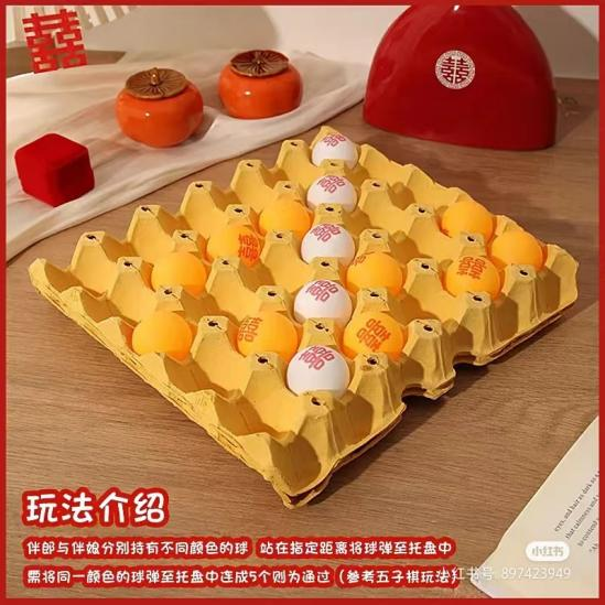 双人游戏:乒乓球五子棋(乒乓球在鸡蛋壳上面连成线则赢得人员可以获得一个盖章)