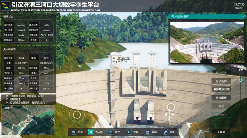 160公里!一端是“猛禽”在秦岭腹地的实际作业区,只见它忽高忽低地辗转腾挪着机身,精准测量着大坝、山体,以及河道整体的相关数据。另一端,架在西咸新区沣西新城西部云谷里,连接着引汉济渭工程1:1的数字孪生系统。这条“看不见”的线将虚实场景精准连接起来。“我们此刻在这个虚拟系统的画面中,所控制的任何东西,在另一端的实体场景里有反应。反过来,实体场景里的东西发生变化,在虚拟场景里也得有相应呈现。”工作人员一边用鼠标点着虚拟场景中的不同位置,“猛禽”也在实景中拍摄着相应的河道、山体位置。