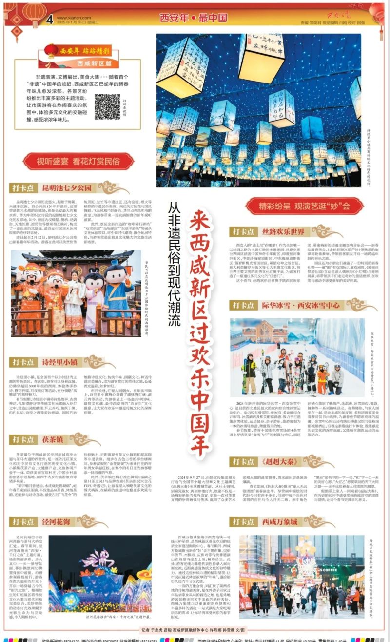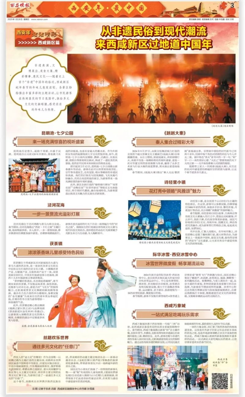 非遗表演、文博展出、美食大集、精彩赛事、惠民文化……随着史上首个“非遗”中国年的临近,西咸新区巳巳如意蛇年春节的“年味”愈发浓郁。各景区纷纷推出丰富多彩的主题活动,让市民游客在热闹喜庆的氛围中,体验多元文化的交融碰撞,感受那浓浓的年味儿。