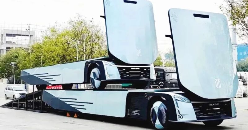 子弹头式“前脸”、流线型车身、配备厨卫设施的超宽驾驶室……在位于西咸新区泾河新城的陕汽控股旗下德创未来汽车科技有限公司(以下简称“德创未来”)门口,一辆重卡牵引车格外吸引眼球。