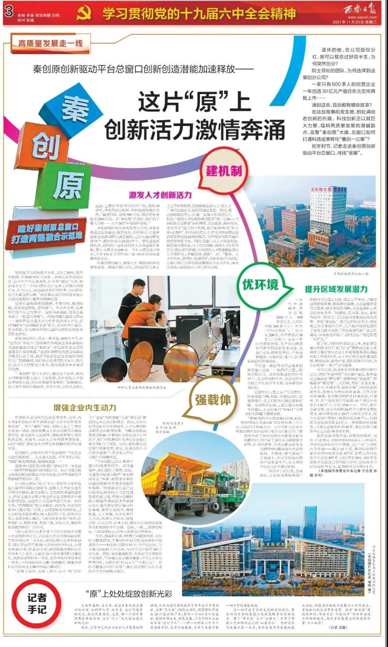 今天,西安日报、西安晚报整版报道《这片“原”上创新活力激情奔涌》聚焦西咸新区围绕秦创原总窗口定位,完善人才工作体制机制,加快科创载体建设,持续优化创新生态,在“科技创新”的新赛道跑出新的加速度。