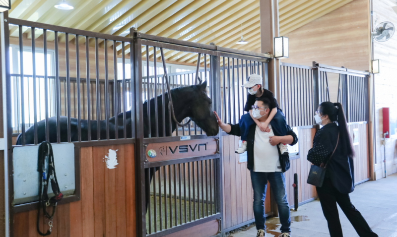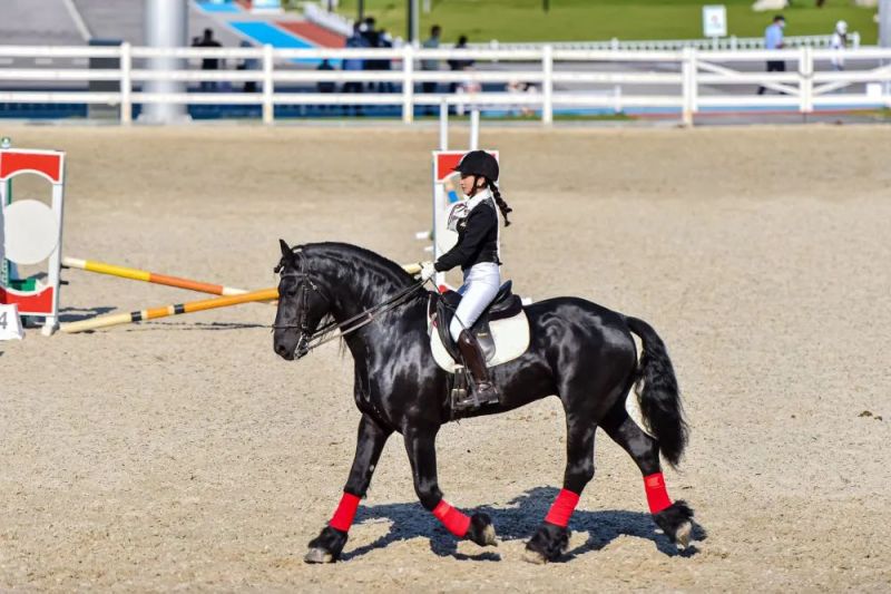 距离全运会闭幕已逾七个月,这个赛场在做好疫情防控的前提下显得格外热闹。在阳光的照耀下泛出夺目金色的沙地上,三匹温血马正配合着骑手进行奥运会比赛项目马术盛装舞步和障碍赛的行进和跳跃,观众席上的孩子们都一心一意地注视着场地里骑手和马匹的一举一动。“看,这就是原产于荷兰的弗里斯兰马,因为它鬃毛柔顺飘逸,行进间体型优雅、步伐灵动,被称作‘会跳舞的马’,是盛装舞步比赛的主要马种。”观众席上的西安市民李政伦向孩子耐心讲述着比赛规则和马匹特点,做起了“启蒙教练”。