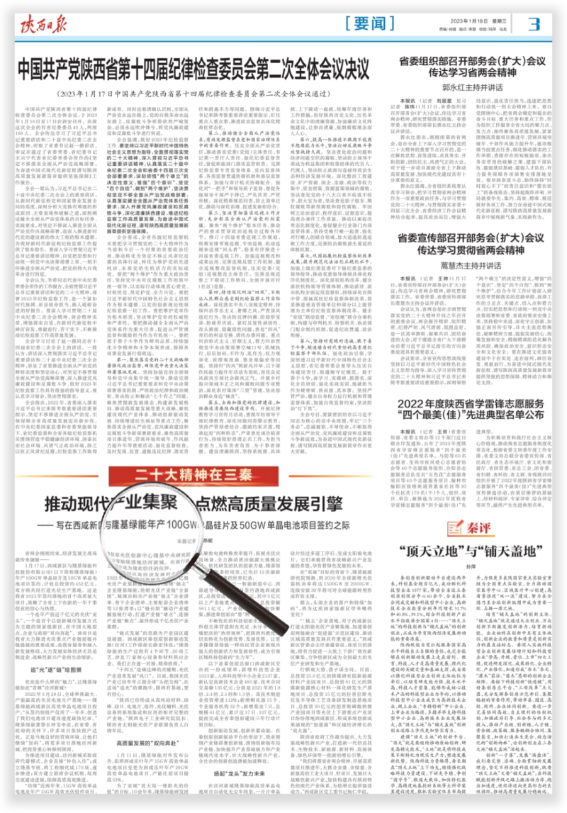 省两会刚刚结束,经济发展主战场就传来捷报——1月17日,西咸新区与隆基绿能科技股份有限公司(以下简称隆基绿能)年产100GW单晶硅片及50GW单晶电池项目签约,计划总投资约452亿元。双方将共同打造光伏生产基地。这是我省2023年签约落地的首个高质量大项目,鼓舞了全省上下在新的一年干事创业的信心与热情。