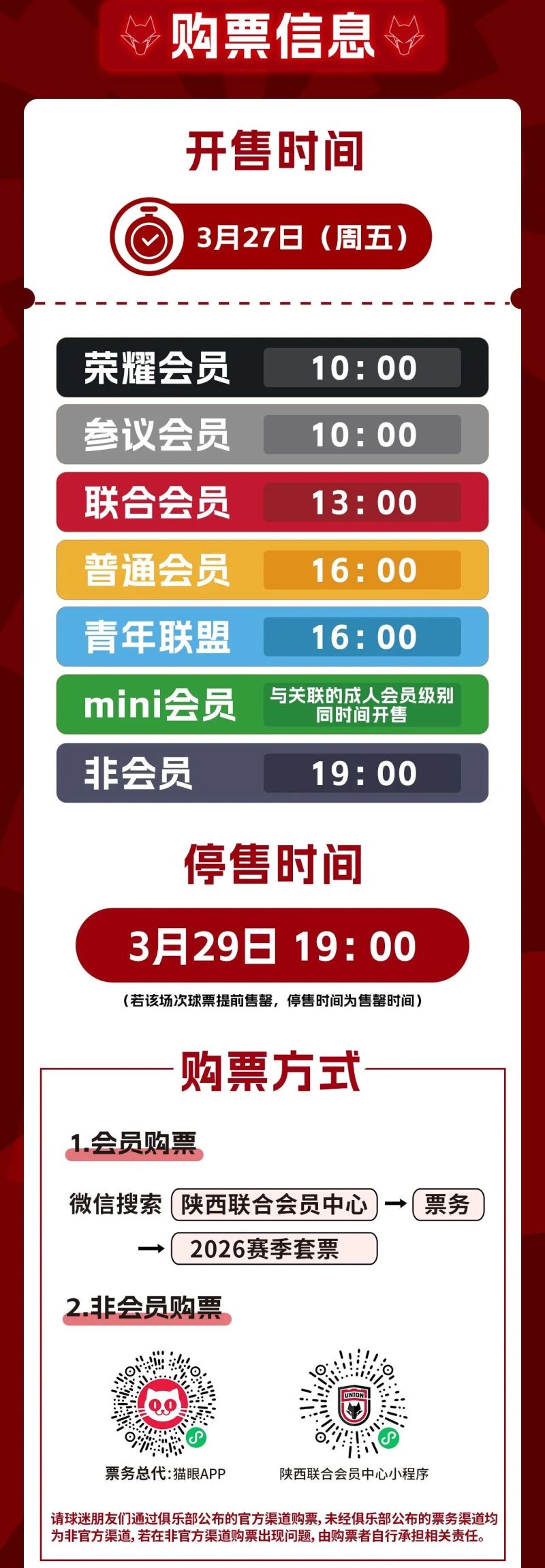 3月26日,陕西联合足球俱乐部正式发布2026赛季中超联赛主场套票销售计划,将于3月27日上午10点陆续开启套票申购。