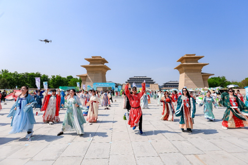 春末夏初的秦汉新城绿意盎然,陕历博秦汉馆南广场游客如织。