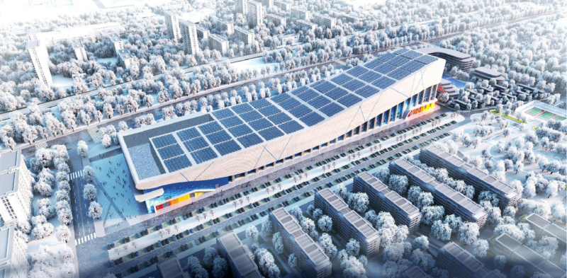 从外观上来看,际华冰雪·西安冰雪中心整体外观独特且造型新颖,由南到北呈现“坡式”曲面流线造型,如同“雪道”样式。中心引入了“双碳”减排、近零能耗、绿色建筑理念,采用极具针对性的围护结构和关键部位冷热桥设计,大幅降低建筑本体能耗,并通过建设屋面太阳能光电一体化系统,满足功能空间冷热需求,解决能耗及成本问题,建筑综合节能率达99.86%,被中国建筑节能协会认定为近零能耗建筑。
