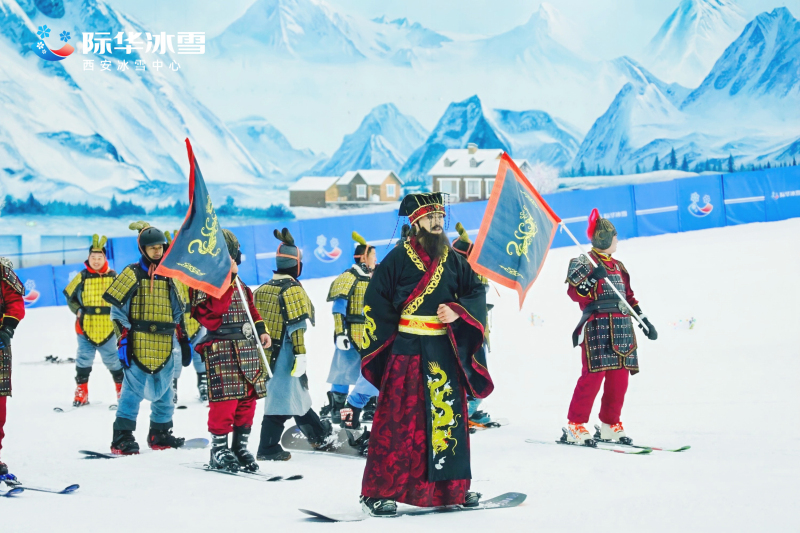 随后,伴随着壮丽恢宏的鼓乐,《秦汉唐韵》滑雪表演,将传统文化与冰雪运动创新融合,赢得了现场观众的阵阵掌声。“秦始皇”带领将士,“汉武帝”携“张骞”和“司马迁”,“李白”手持酒壶从雪道上徐徐滑下。滑雪演员们身着秦汉唐朝的服饰,在雪道上进行了精彩纷呈的技巧展示,仿佛将观众带入了历史的时空隧道。