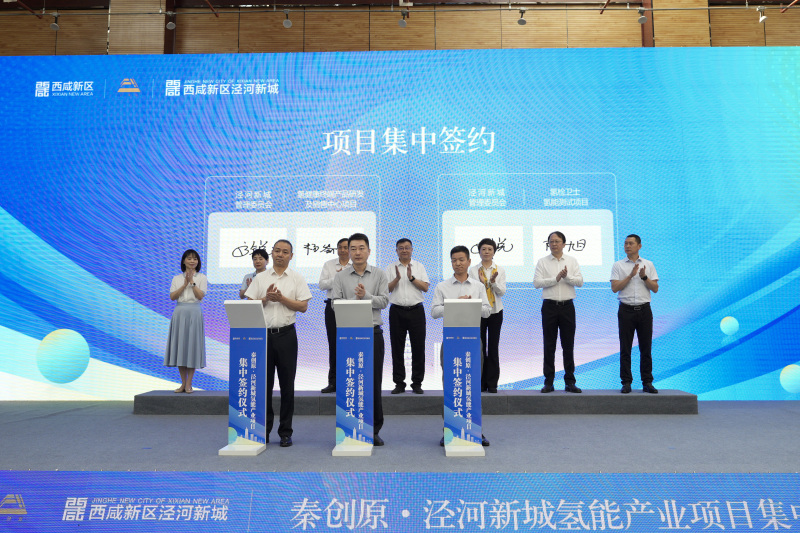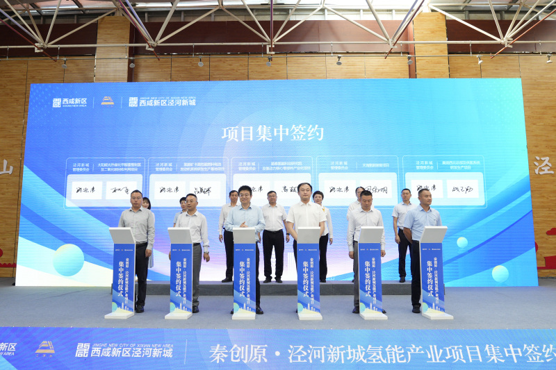 在与会领导的见证下,泾河新城与昆山易泰汽车科技有限公司、盛世盈创氢能科技(陕西)有限公司等11家企业现场成功签约。这些项目包括,易泰氢能科创研究院及氢动力核心零部件产业化项目、氢能矿卡高性能燃料电池发动机系统研发生产基地项目、奥扬西北总部及供氢系统研发生产项目、太阳能光热催化甲醇重整制氢及二氧化碳回收利用项目、天海氢能装备项目、氢健康终端产品研发及销售中心项目、氢检卫士氢能测试项目、秦深绿动分布式光伏制氢总部项目、氢燃料电池商用车整车项目、中江国际光伏发电投资建设暨西北总部基地项目、润弘升信息科技研发中心项目。