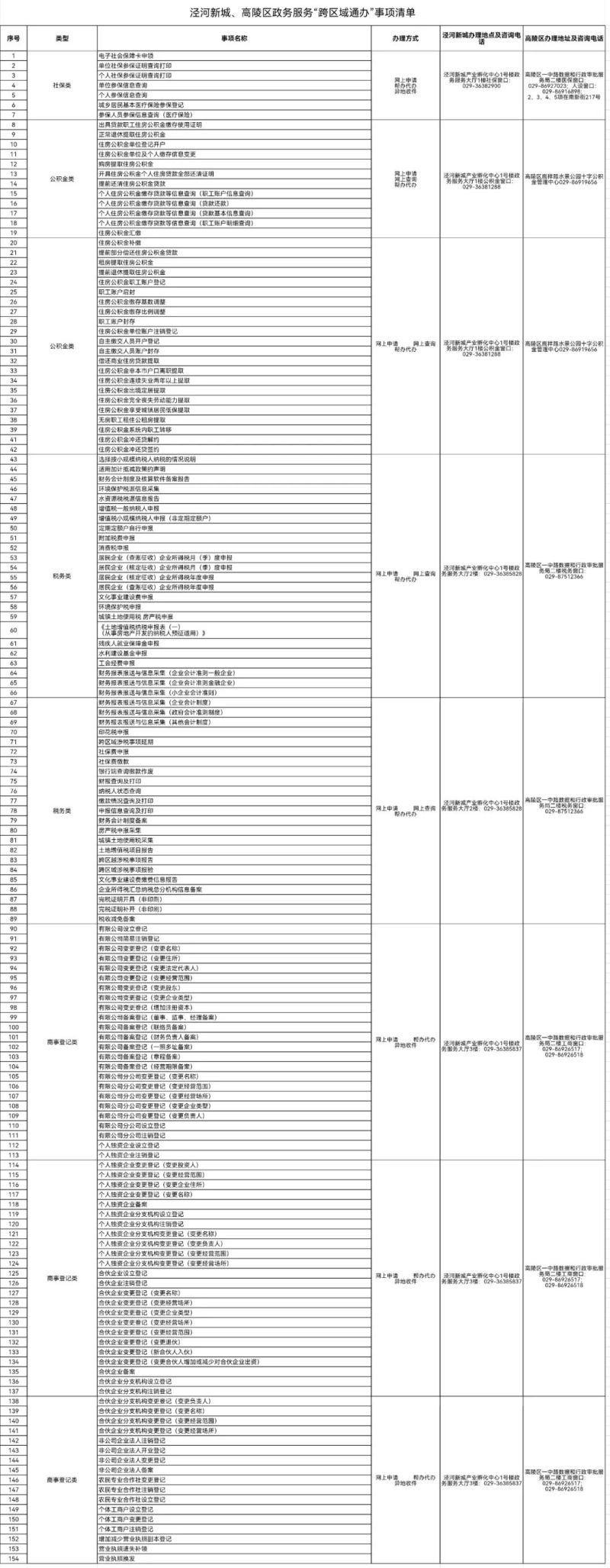 近日,西咸新区泾河新城与西安市高陵区共同签署政务服务“跨区域通办”战略合作协议,进一步助推实现跨区数据共享、等效互认、高效办结,双方共同梳理了包含社保、税务、商事登记等154项“跨区通办”事项,详细清单如下:
