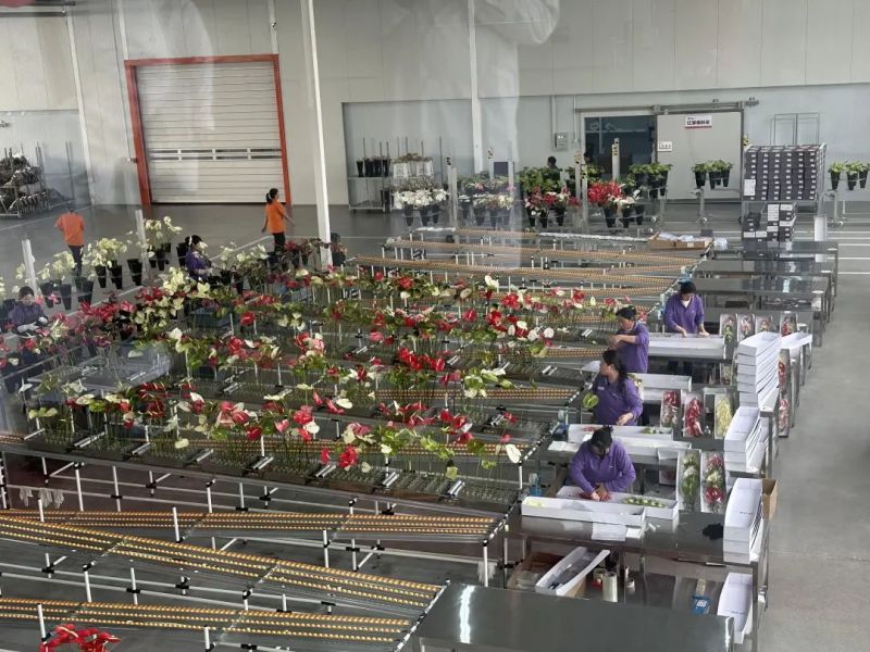 从平台俯瞰,巨大的透明玻璃内各色红掌、玫瑰欣欣向荣,生机盎然;另一侧的操作间内,工人们正在有条不紊地将分级、插管后的鲜切花进行最后的包装。