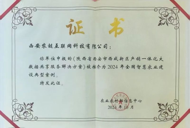 近日,农业农村部公布了2024年智慧农业建设典型案例评选结果,全国共有85个案例获评国家级典型案例。沣西新城入区企业西安农链互联网科技有限公司申报的产销一体化大数据共享服务解决方案成功入选。