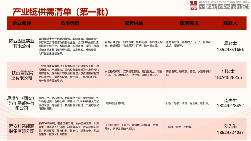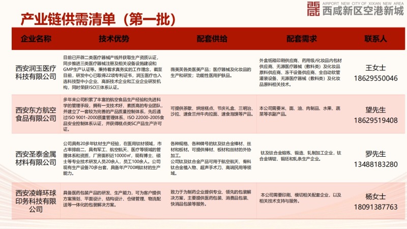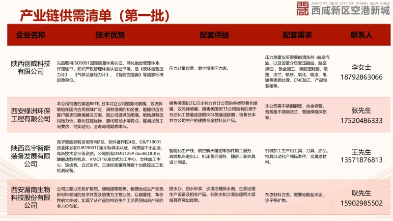 为进一步优化空港新城产业营商环境,促进各产业链企业在技术创新、产品配套等方面的融通协作。空港新城以延链补链强链为目标,充分对照陕西省、西安市重点产业链,紧密围绕新城重点工业企业,深入摸排和梳理了技术优势、供需信息等,形成新城第一批产业链供需清单。