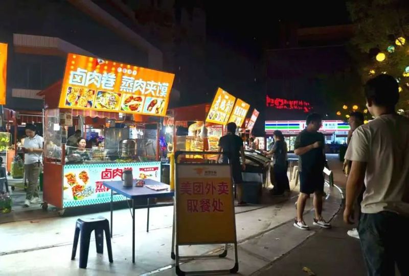 7月起,夜市增设外卖集中取餐点。“我们是西咸新区首个以夜市整体上线的外卖店铺,现有200多种餐品。”负责线上运营的李成介绍。大学毕业两年的他曾与同学尝试社区电商和餐饮创业,如今被夜市的环境与管理吸引,将这里作为事业新起点。