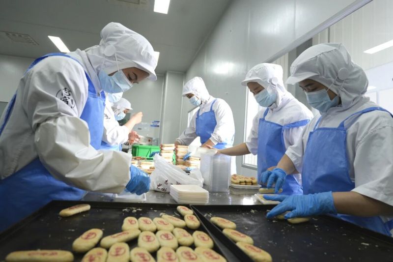 “这绿豆糕印着大雁塔图案,掰开后还有宝相花纹路!”在西安志宽食品有限公司(以下简称“志宽食品”)文创制作区,工人师傅手持模具一压一脱,一块带有西安文化印记的糕点便制作完成。这家创立于1992年的老牌企业,三十余年来始终坚守“纯手工”根基,秉持“先做人,再做饼”的初心。每天上午9时,十余位工人分散在各个工位,揉、擀、包、烤等工序行云流水,延续着传统糕点的制作技艺。