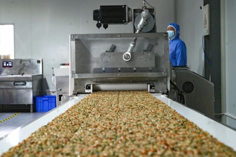 走进福财记的生产车间,没有传统炒货厂的呛人油烟,只有微波设备的轻微声响。内蒙大瓜子在传送带上慢慢移动,不用铁炉翻拌,靠自己内部的水分子振动生热,“从里到外熟得均匀,还能精准控制水分,既脆又不上火。”总经理沈朋指着设备介绍。更方便的是分装——机械臂自动撑开袋子、装瓜子、封口,一分钟能装30袋,高峰时能达到60袋,比人工快3倍,且全程无需人工接触,干净卫生。