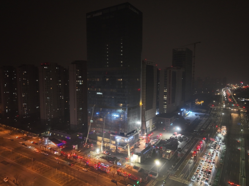 演练假定F1号楼25层发生火灾,楼内充满烟雾,有人员被困,火势呈立体式燃烧蔓延。警报声响起,顿时“起火点”冒出“浓烟”,微型消防站队员最先按照预案到达现场进行初期“火灾”扑救,并组织楼内人员快速疏散。随后,举高喷射消防车、登高平台消防车、灭火无人机等各类消防车呼啸而至,消防救援人员迅速到达现场开展火情侦察。交警、医疗、供水、供电等各方力量也到场协助处置。