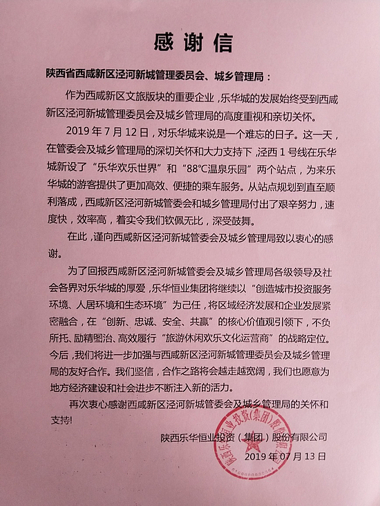近日,陕西乐华恒业投资(集团)股份有限公司派代表专程来到泾河新城城乡管理局,将一面印有“亲商助企,服务为民”的锦旗和一封情真意切的感谢信亲手送到城乡管理局相关负责人手中,一边表示对泾河新城协调公交车、方便游客、助力企业发展一事的感谢,一边表达了在泾河新城投资兴业的信心和决心。