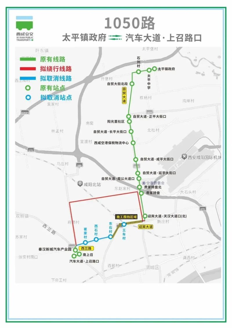 1050路、1140路自秦汉新城汽车产业园站点后绕行至咸北大道、北塬大道至迎宾大道,从王府井赛特奥莱西门恢复原线路。