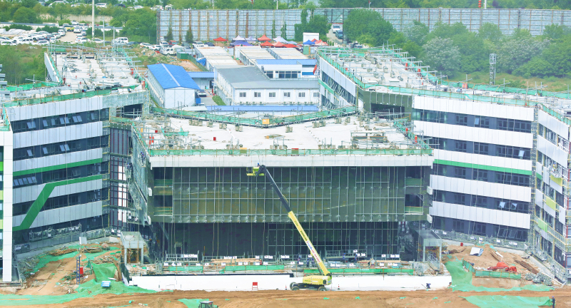 目前,医院4到10层已完成装饰隔墙;4到12层已完成桥架安装;住院部精装样板区吊顶龙骨全部完成;二层消防、排烟、空调管道安装完成;室外西侧管网安装、绿化施工中,裙楼屋面种植土完成;污水处理站和液氧站基础已完成。