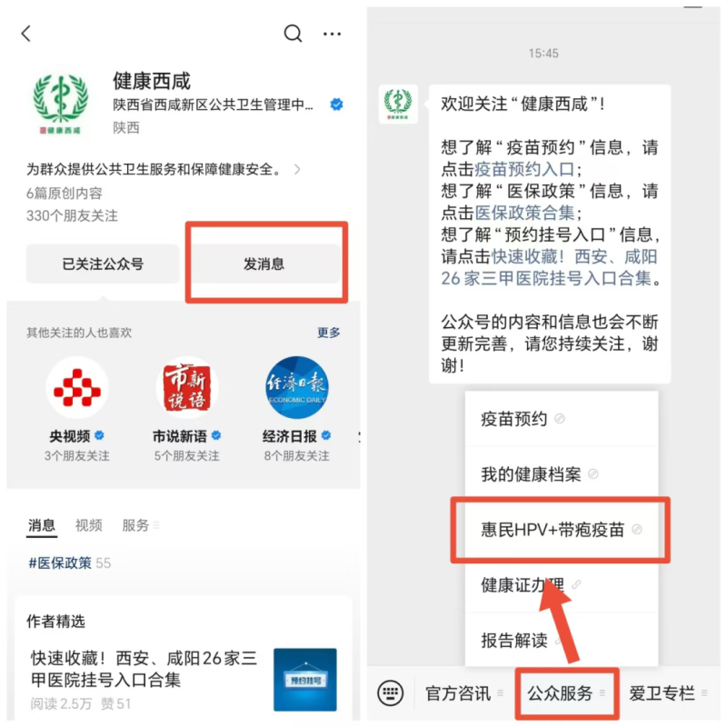 ①搜索“健康西咸”公众号,点击“发消息”,进入菜单栏页面,点击“公众服务”,选择“惠民HPV+带疱疫苗”,即可进入“知苗易约”小程序。
