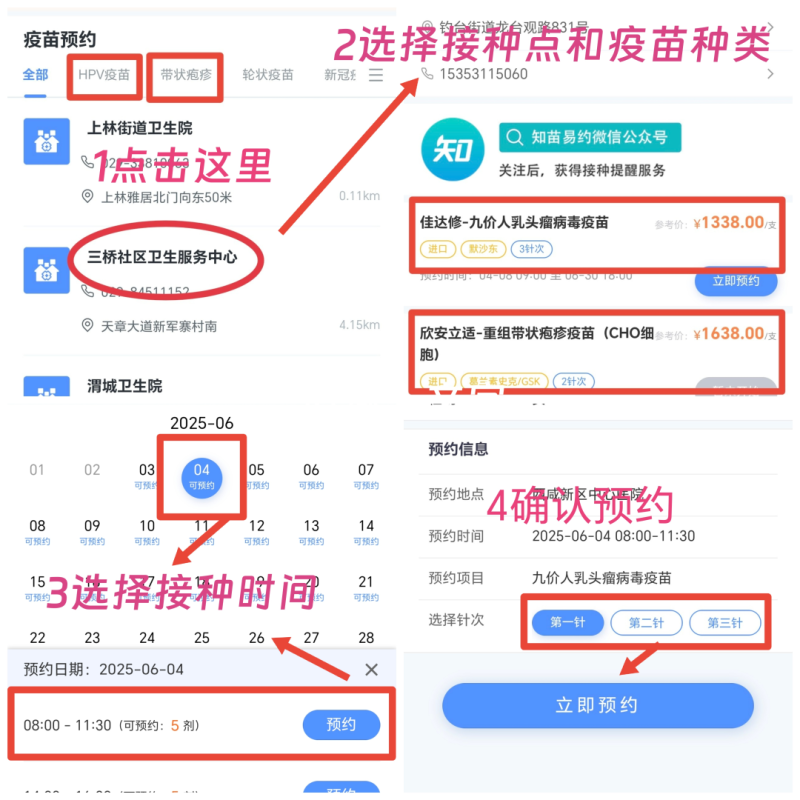 ③完善信息后,返回“接种点”页面,可通过快捷筛选栏中“HPV疫苗”和“带状疱疹疫苗”选出附近接种点。选择接种点→选择疫苗种类→选择接种时间→完善个人信息、选择接种针次→确认预约→即可预约成功。