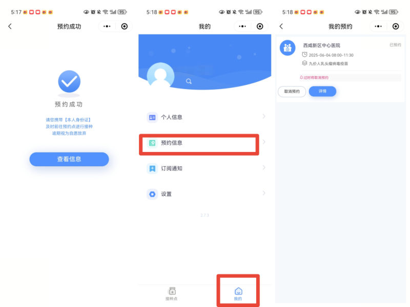 ④页面显示预约成功后,可在“我的”页面点击“预约信息”查看详细信息。