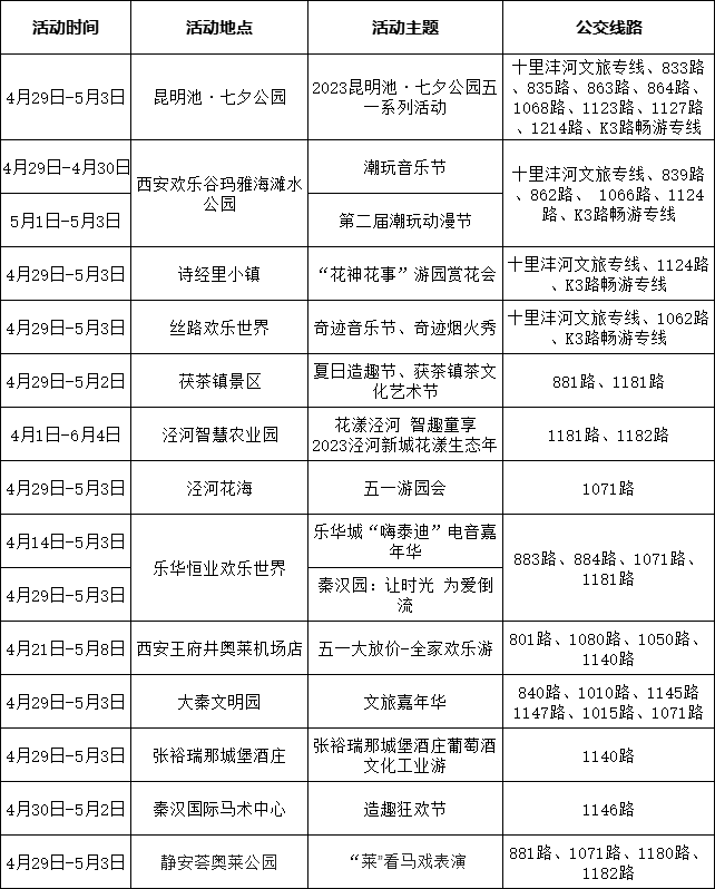 4月28日,丝路欢乐世界开园,您可以乘坐上述常规公交线路到达景区,五一期间,西咸公交将增配途径线路运力,让您顺利乘车。