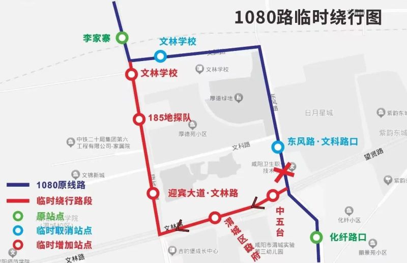 受道路施工影响,自5月8日起,西咸公交集团对1080路、1145路进行临时绕行运营。