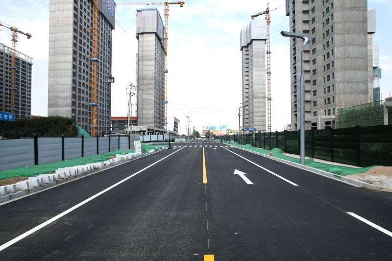 目前,已完成主车道铺油及道路标线施工,路缘石安装及人行道铺装全部完成,正在进行路灯安装。