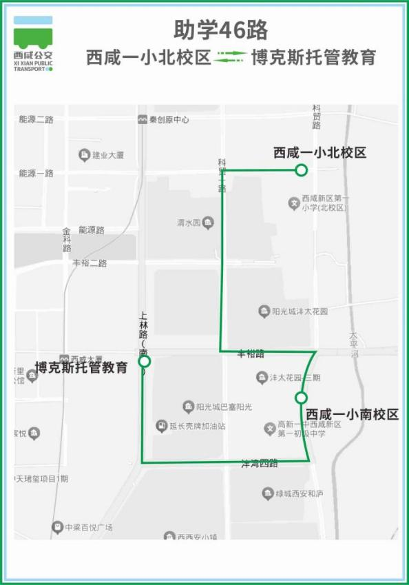 由“西咸一小北校区”始发,途经科贸一路、丰裕路,至“博克斯托管教育”,线路全长3.5公里。