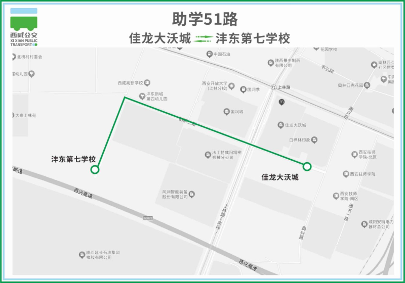 由“佳龙大沃城”始发,途径创新二路、科信路,至“沣东第七学校”,线路全长1.6公里。