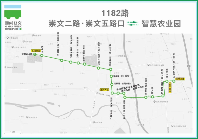 由“智慧农业园”站始发,沿高泾大道西段、泾晨路、智苑一街、泾河二路、泾河大道东段、正阳大道北段、崇文二路,行驶至“崇文二路·崇文五路口”。