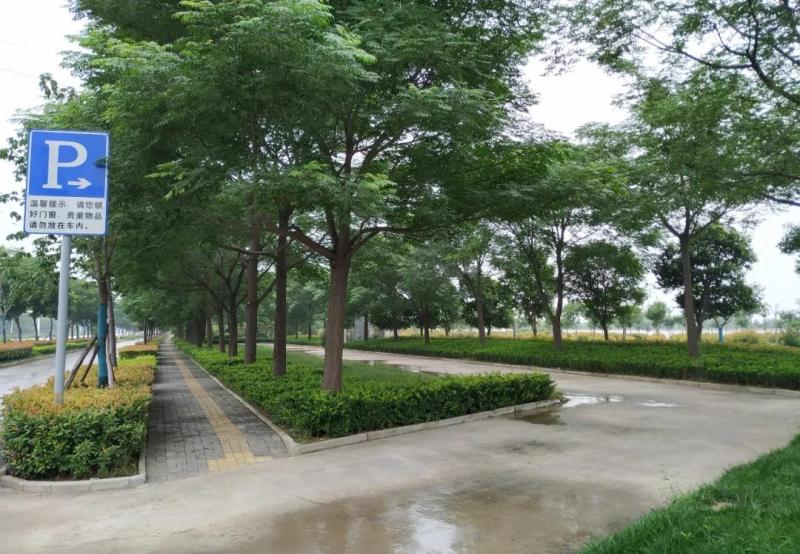 这是位于西咸新区泾河新城正阳大道北段两侧绿化带的生态停车场,地面使用透气、透水性铺装材料铺设,间隔栽植绿化植物,将停车空间与园林绿化空间有机结合,形成了上有大树遮荫,下能透水让雨水渗透地表调节地面温度、兼作绿化灌溉的生态小环境,整个停车场就像一座“会呼吸的停车公园”。