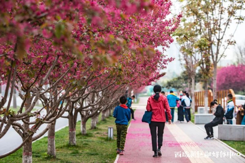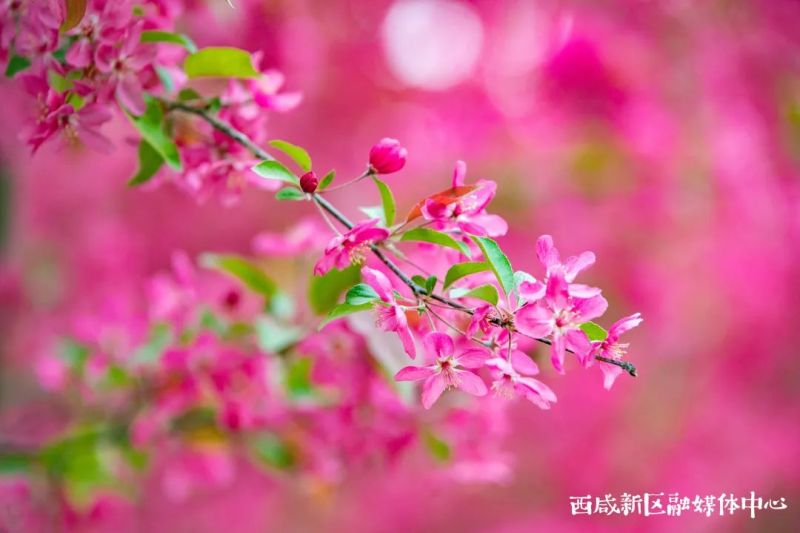 秦创原·金湾科创区,上林路(南段)道路两旁,盛放的海棠花绵延数公里。微风过处,弥漫着淡淡芬芳。