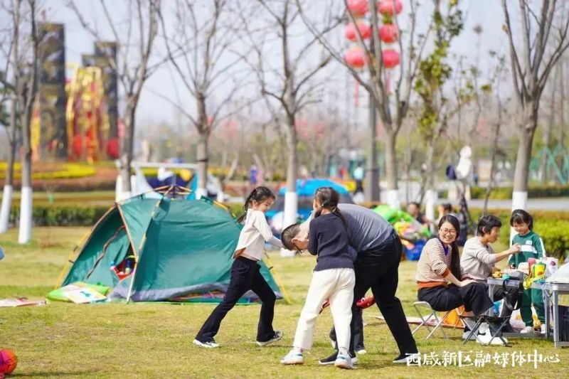 昆明池·七夕公园,五颜六色的帐篷、满载欢乐的滑板车、梦幻感十足的泡泡……拥有着“水下森林”景观的昆明池·七夕公园,在东西草坪和积草园预留了大片空地供游客野餐、露营、放风筝,尽情玩耍。