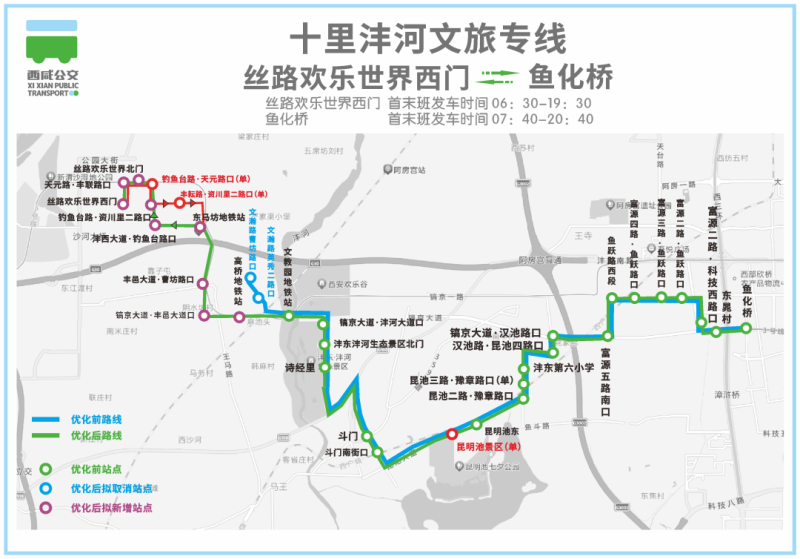 新线路由“丝路欢乐世界西门”出发后,沿天元路、钓鱼台路、资川里二路、丰邑大道、镐京大道途经“文教园地铁站”后沿原线路走向至“鱼化桥”