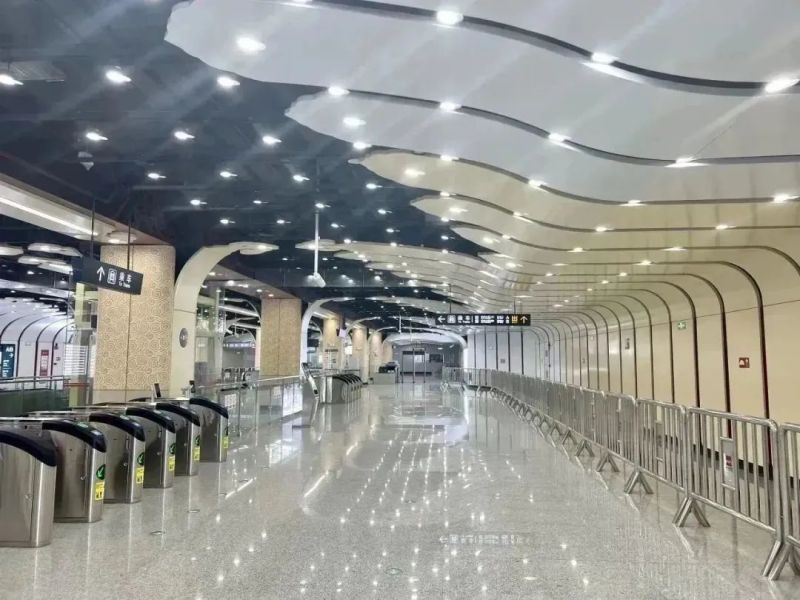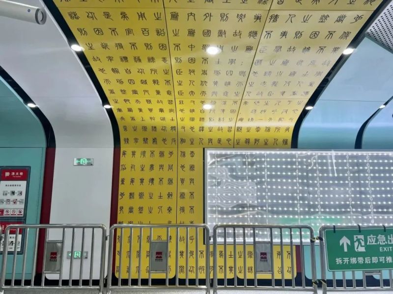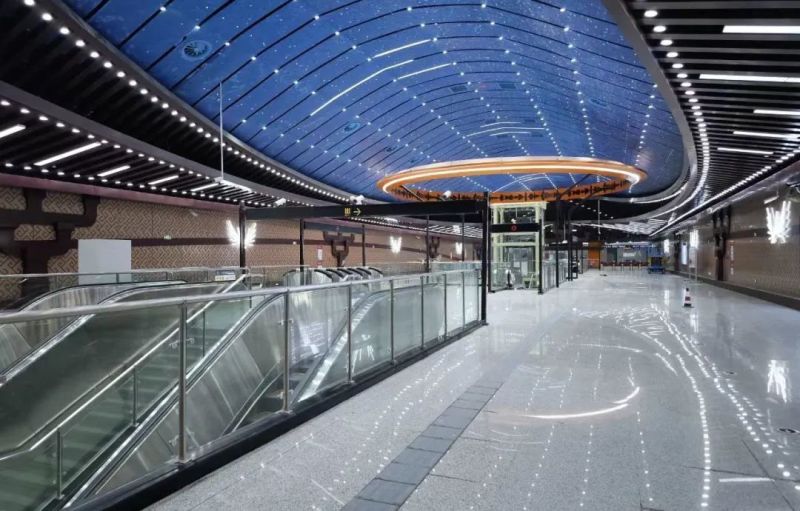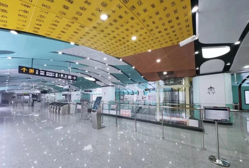 西安地铁1号线三期全线车站装修设计构思结合秦代建筑和历史文脉,选取秦代元素符号,形成“山水风宇、陵波飞檐”的设计理念,叠加竹简、小篆、青鹞、玄鸟的动势意象,在空间中形成从两侧墙向顶部中央由实到虚的过渡。各车站装修结合所处城市区域的环境风貌,文化底蕴和区域色彩,进行抽象表达,以“点、线、面”的手法,融入至西安轨道交通网络之中。