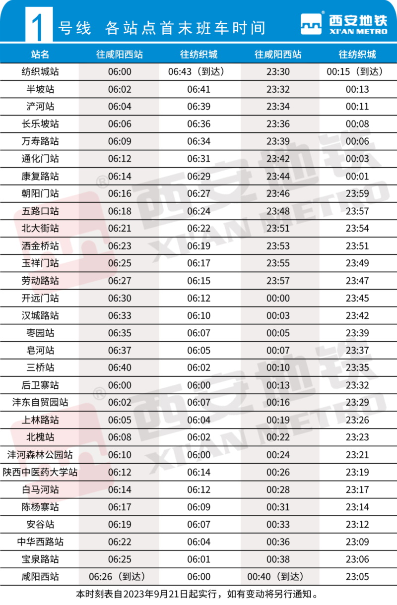 西安地铁1号线三期开通后与既有1号线贯通运营,全线首班车采用多点发车方式。其中:纺织城方向首班车分别由咸阳西站、沣河森林公园、后卫寨三个车站发出,发车时间均为6:00。往咸阳西站方向首班车分别由纺织城、后卫寨两个车站发出,发车时间均为6:00。纺织城站开往咸阳西站方向末班车发车时间为23:30,咸阳西站开往纺织城站方向末班车发车时间为23:05。