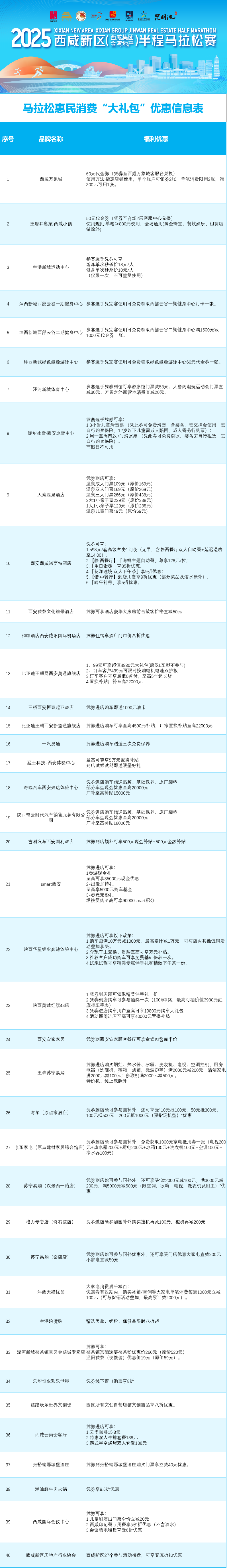 西咸新区房地产行业协会联合27个品质楼盘推出“奔跑安居计划”。参加过历届西咸马拉松赛事,或是已通过官网报名参加2025年西咸半程马拉松赛事的选手,在活动期间购买新区指定楼盘的新建商品房,能享受开发商提供的专属购房优惠(具体优惠以项目公示为准)。