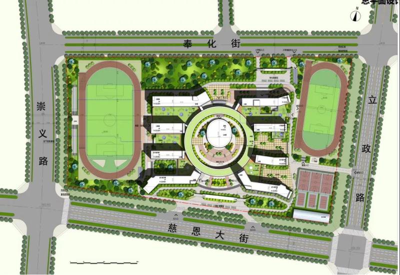 其中,“一环”为梦想之环,包括报告厅、食堂及图书馆,可通过富有层次感的独特空间布局,为孩子们提供发展专项特长的专项教学空间。“八枝”包含了小学、初中、高中教学楼和公寓楼,“两翼”则代表东西两侧的操场,“一环”将“八枝”连接起来,“两翼”作为与道路之间的缓冲区,减少噪音干扰,创造安静的教学环境。