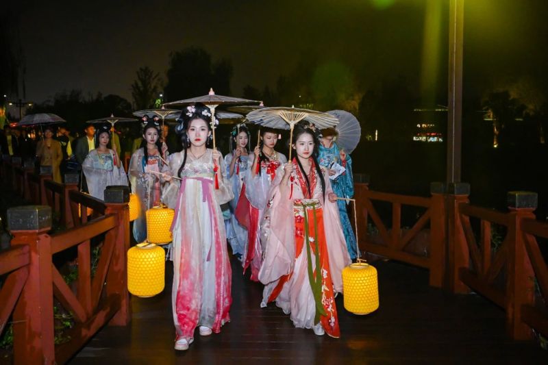 华灯初上,身着各朝代服饰及婚服的演员尽情展示中国服饰之美,还有“牛郎织女”“月小老”为游客介绍浪漫七夕故事。