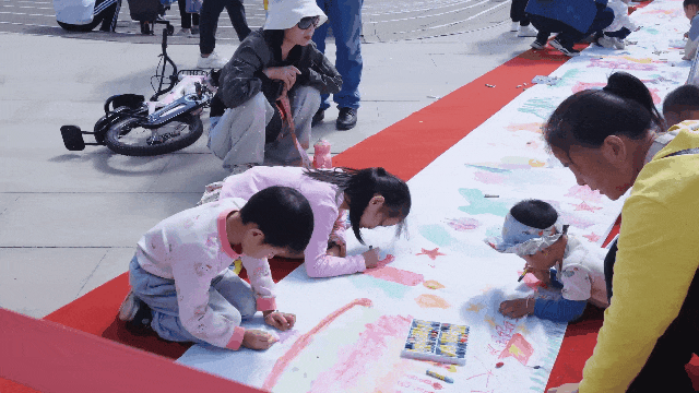 在池望广场两侧,百米画卷缓缓展开,游客们可以手握画笔在百米长卷上,用五彩斑斓的色彩绘制起波澜壮阔的时代画卷,描绘对于祖国的美好祝福。